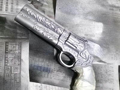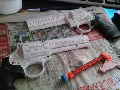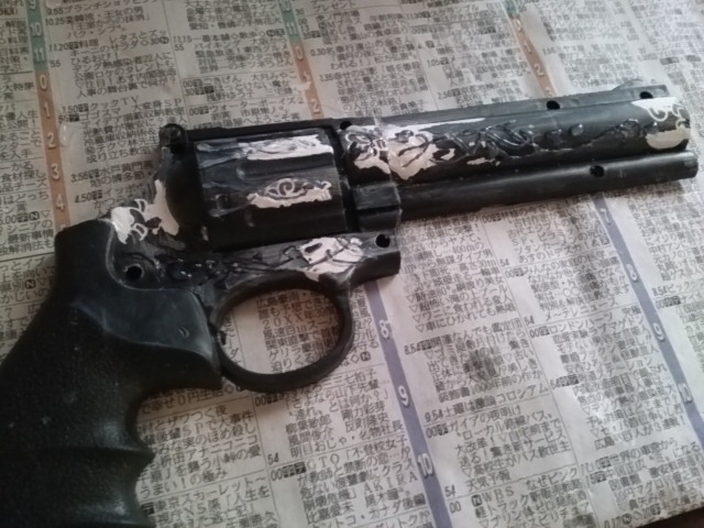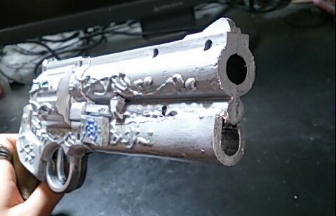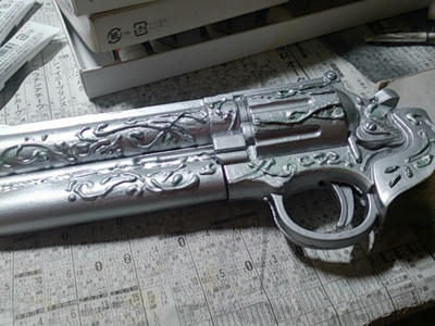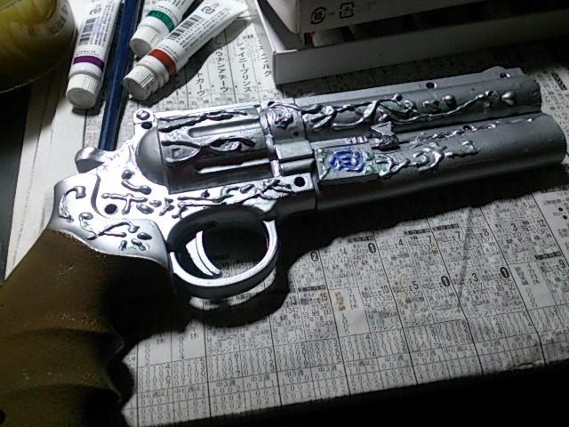 グルーガンでブルーローズの模様を描いてます。見辛いですね。公式はネロくん自身が暇つぶしに銃身に掘ってるレリーフとのことですがものすごく面倒くさいので盛っちゃいます。